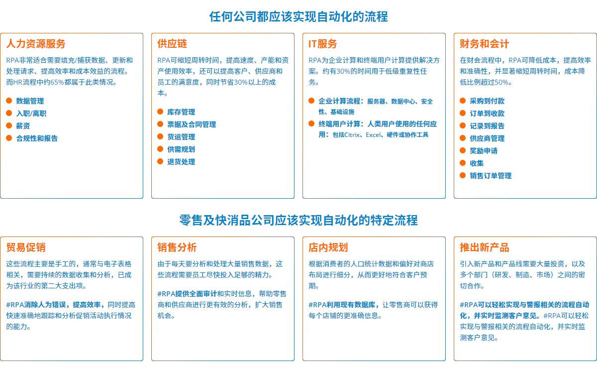 實施企業(yè)RPA讓全球的零售和快消品企業(yè)能夠?qū)W⒂谡嬲匾氖聞眨嚎蛻?。員工可以在幾秒鐘內(nèi)獲得相關(guān)的客戶信息,并提供個性化服務。財務會計、新產(chǎn)品或新客戶建立、客戶支持、入職和離職流程、薪資、供應索賠、管理報告、店鋪維護只是經(jīng)大規(guī)模驗證后,可以充分發(fā)揮其功能的部分領(lǐng)域。方法如下: